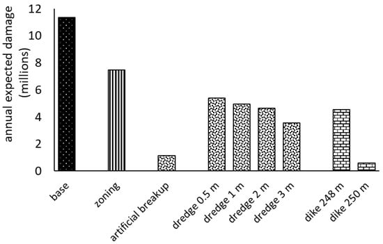 The expected annual damages for different mitigation scenarios (the figure is adopted from [,] (used with permission) and modified here by adding the annual expected damage for the zoning regulation).