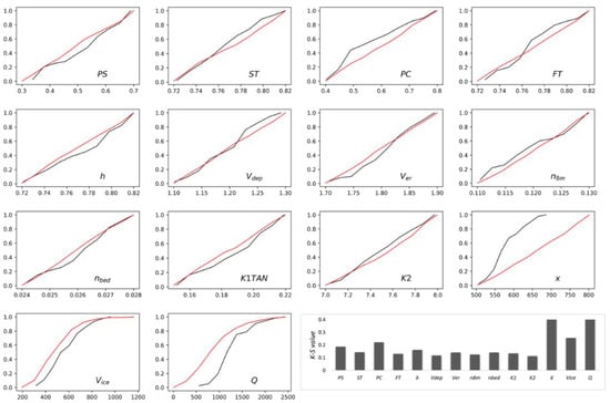 Cumulative distribution plots of behavioural (black) and non-behavioural (red) and K-S values for the model parameters and boundary conditions.
