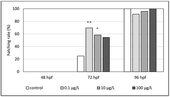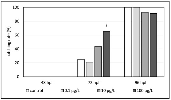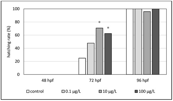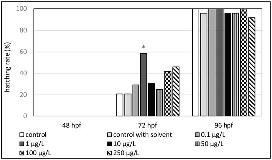 Hatching rate (%) of zebrafish embryos exposed to octocrylene (hpf—hours post fertilization). The asterisk indicates a significant difference (* p < 0.05) between the control and experimental groups at the same time of exposure.