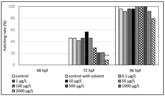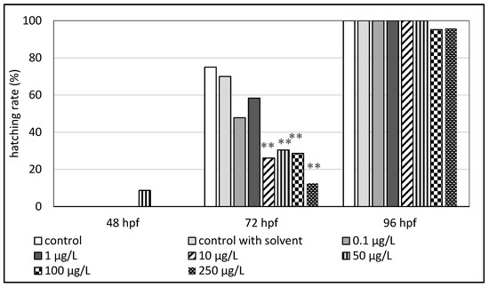Hatching rate (%) of zebrafish embryos exposed to 4-methylbenzylidene camphor (hpf—hours post fertilization). The asterisk indicates a significant difference (** p < 0.01) between the control and experimental groups at the same time of exposure.