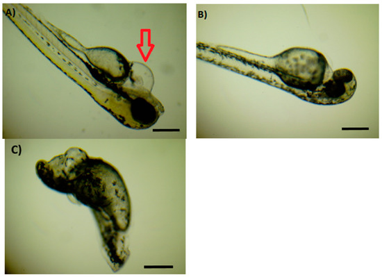 Pericard edema of zebrafish larvae in the group exposed to 250 µg/L of 4-methylbenzylidene camphor at 72 h post fertilization (hpf) (A). Zebrafish larvae in the control group at 72 hpf (B). Total body deformation of zebrafish larvae in group exposed to 10 µg/L of 4-methylbenzylidene camphor and octocrylene at 72 hpf (C). Scale bar = 0.4 mm.