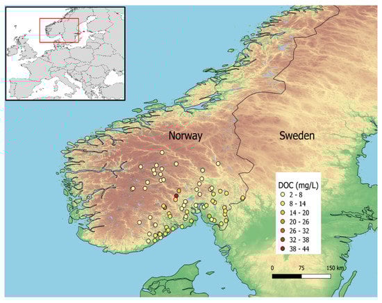 Surface water samples from 73 lakes in southeast Norway (Figure 1) were collected in autumn 2019 for detailed biogeochemical studies by the Centre for Biogeochemistry (CBA) at the University of Oslo, Norway. They were selected as a subset of the lakes sampled during the national lake survey, itself repeating the sampling of previous campaigns conducted in 1986 and 1995 [21,22]. These lakes span a wide range of water quality properties, notably DNOM, covering different catchment sizes and elevations. Most Norwegian lakes are oligotrophic or dystrophic, although a few of the lakes in the selection have mesotrophic or eutrophic characteristics (Figure S1).