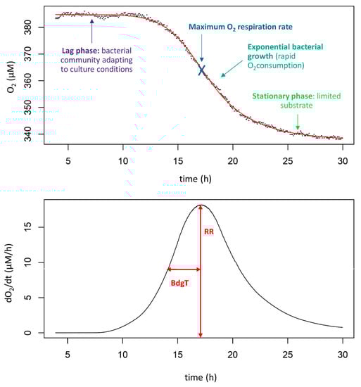 - The decline in oxygen concentration in each vial was fitted as a constrained spline (median R2 = 0.97) and the derivative of the equation was calculated (“scam” and “base” package on R). Typically, the derivative curve displays a peak, corresponding to the maximum rate of oxygen consumption. Two parameters were extracted from this peak, as shown in Figure 4: the maximum respiration rate (RR) and the biodegradation period (BdgT). The first half of the peak was used to determine the BdgT to avoid effects of limited O2 or accumulation of toxic wastes from the bacterial community (Section 2.3.2).