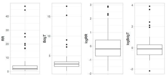 Estimates (pooled for n > 25) of parameter coefficients in lasso regression models of log(RR), log(RRn), and log(BdgT).