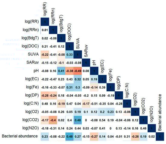 Log(RR) is significantly correlated (p-value < 0.05) with sUVa (r = −0.22), log(DP) (−0.28), log(CO2) (−0.17), and cells counts (0.23) (Figure 5). It is also strongly, though not significantly, correlated with log(C:N). The correlation coefficient between log(RRn) and log(RR) is high (r = 0.81), although the p-value is higher than 0.05. Therefore, this correlation is not significant. Log(RR) has negative significant correlations with log(DP) (r = −0.24) and log(CO2) (r = −0.4). Log(BdgT) is not correlated with log(RR) or log(RRn), but is significantly correlated with pH (r = 0.41) and log(C:N) (r = −0.19). It has also weak significant correlations with sUVa and SARuv (r = −0.08 and r = −0.1).