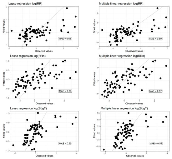Lasso multiple linear regressions were applied to the dataset of 12 selected explanatory parameters (Table 2) for each of the three log transformed response variables. The lasso regression is a statistical tool allowing covariates with little explanatory power to be discarded, thus only keeping significant covariates. The fitted vs. observed values of the multiple linear regression models are plotted in Figure 6. Their performances are presented by residual plots in the Supplementary Material (Part E Figures S7–S9). The mean absolute error of each of the models was low, but the normal Q-Q plots display residuals skewed to the right, and not following the normal distribution. The estimates for each lasso regression model are plotted in Figure 7.
