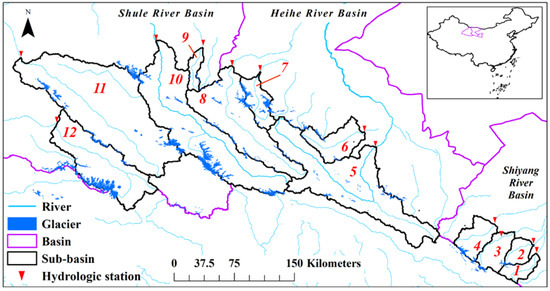 The Qilian Mountains are an important area for glacier distribution in China. A total of three inland river basins in the northern Qilian Mountains, including the Shiyang River Basin (SYRB), the Heihe River Basin (HHRB) and the Shule River Basin (SLRB), are recharged by glacial meltwater [32]. Within each basin, four sub-basins were selected for the study area because of common characteristics of their runoff: originating in the Qilian Mountains; recharged by glacial meltwater; having an upper catchment of the basin virtually unaffected by human activities; and the basin outlet runoff being monitored by long-term hydrological stations (Figure 1). For 12 sub-basins, the catchment areas were between 656 km2 and 14325 km2, and the annual average runoff was between 0.29 × 108 m3 a−1 and 16.62 × 108 m3 a−1. The glaciers in each sub-basin are also distinguished by the total glacier area, and the average glacier areas are between 3.75~469.52 km2 and 0.27~2.25 km2, respectively. However, due to the difference in glacier numbers, the sub-basin with the largest total glacier area (Shule) and with the largest average glacier area (Dahaerteng) are inconsistent (Table 1). By comparison, the ratio of total glacier area to catchment area in the 12 sub-basin area was also notably different; from 0.44% in Zamu to 7.95% in Hongshui.