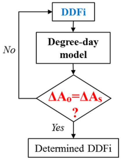 In the general model, the DDF of snow and ice were set to constant in a region [41]. However, the DDF is affected by various topographic and climatic features, even among adjacent glaciers. Huss and Hock established a validation program to approach individual DDFs for each single glacier worldwide [42]. In this study, similar processes are used to validate the DDF of snow and ice.