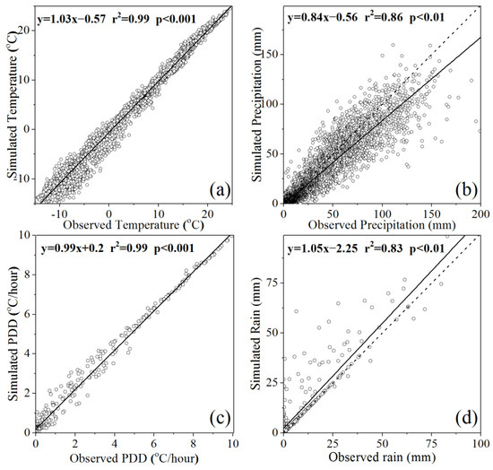 The estimated yearly temperature and precipitation were 4.84 °C and 417.72 mm, respectively, and both were in good agreement with the observed values of 4.43 °C and 401.25 mm from 1960–2016. The R2 between observation and simulation was 0.86 (p < 0.001) and 0.99 (p < 0.01) respectively (Figure 3a,b). The slightly lower precision of precipitation interpolation was mainly due to uneven distribution of precipitation during the year, but it remains reliable compared to other precipitation products. The R2 between the calculated and observed PDD was 0.99 (p < 0.001) (Figure 3c). The R2 between the calculated and observed rainfall was 0.83 (p < 0.01) (Figure 3d), with a small amount of the calculated rainfall slightly higher than the observed (this was also true for simulated and observed snow); this was partly due to the higher interpolation of total precipitation, and partly to the methods used in this paper which were inevitably ineffective for extremely low precipitation amounts. These deviations did not significantly impact the final results of the model because they occurred only in individual months.