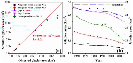 Model results were mainly validated against glacier area. Figure 4a shows the comparison between simulated and observed glacier area from five glaciers: Ningchan River Glacier No.3 [50], Shuiguan River Glacier No.4 [51], Qiyi Glacier [52], Bayi Glacier (observed in this study) and Laohugou Glacier No.12 [53]. The results indicate that the simulated and the measured area are significantly correlated with R2 and NSE reaching 0.98. Figure 4b shows that the trajectories of glacier area change are also coincident with the observed values.