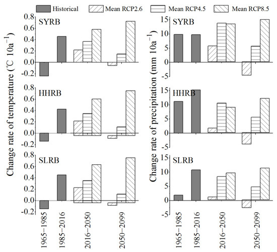 Change rate of temperature and precipitation during 1965~2055 in three basins.