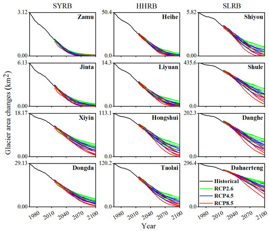 In the future, glaciers will almost disappear in the Zamu Basin in the 2070s under RCP2.6, 4.5 or 8.5. In five other basins, including Jinta, Heihe, Liyuan, Hongshui and Shiyou, glaciers will potentially disappear after the 2080s under RCP4.5 or 8.5. However, glaciers will still exist in Xiyin, Dongda, Taolai, Shule, Danghe and Dahaerteng until the end of this century. Statistics indicate that glacier areas will retreat to 9.2 km2, 6.2 km2 and 2.9 km2, with 83.6%, 88.8% and 94.8% losses in the SYRB in 2099 under RCP2.6, RCP4.5 and RCP8.5, respectively, compared with 1965. In the HHRB, the corresponding area will be 27.7 km2, 17.2 km2 and 6.0 km2 in 2099 with 86.1%, 91.4% and 97.0% retreat, respectively. In the SLRB, the area will be 387.2 km2, 310.4 km2 and 188.7 km2 in 2099, with 58.8%, 67.0% and 79.9% retreat, respectively. In total, the glacier area in all basins will decrease by 64.4%, 72.0% and 83.4% from 1965 to 2099 under the three climate scenarios.