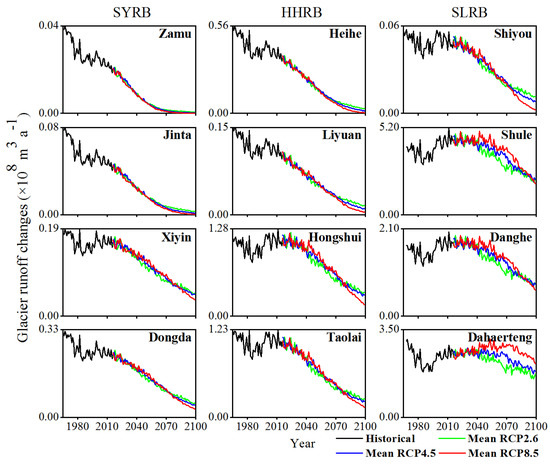 The time of the “peak point” is one of the hotspots in glacial hydrology because it may be a critical moment for regional water resource management strategies, particularly in arid or semiarid basins where glacier runoff is the main component of total runoff. Among the 12 subbasins in this study, Figure 7 indicates that the “peak point” appeared in the historical period; in Zamu and Jinta, the “peak point” appeared in the 1980s. In Xiyin, Dongda, Heihe, Liyuan, Hongshui, Taolai and Shiyou, the “peak point” appeared in approximately 2000. In Shule and Danghe, the peak glacier runoff has potentially already passed under RCP2.6 and RCP4.5, but if the climate changes to RCP8.5, the “peak point” in these two basins will delay to the 2020s–2040s because the increase in precipitation and glacier melting is greater than those under RCP2.6 and RCP4.5, although the glacier area is barely distinguished before 2040 under the three climate scenarios. For the same reason, the “peak point” of glacier runoff in Dahaerteng will appear at approximately 2030, 2045 and 2050 under RCP2.6, RCP4.5 and RCP8.5.