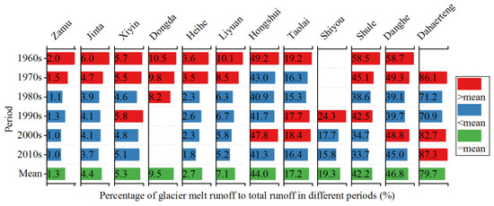 The contribution of glacier melt runoff in each subbasin at different periods. Note: The bar plot and numbers in each column indicate the ratio changes of each subbasin during 1965–2016. The red bar indicates that the ratio in the corresponding period is larger than the mean ratio (green bar) at all times; additionally, the blue bar means that the ratio is smaller than the mean value. The total runoff of the Dongda River was missed after the 1990s, and the hydrological station of the Shiyou River was first measured in the 1990s. This situation is showed as blank in the Figure.