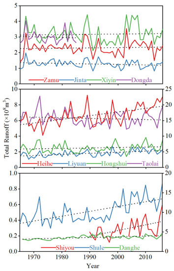All 12 watersheds studied in this paper originate in the Qilian Mountains and precipitation is a major component of the watershed water resources. Therefore, changes in the total water resources of the basins due to changes in precipitation are also a major influence on the contribution of glacial runoff. Figure 9 shows the total runoff of each subbasin. In particular, in the east-central basins, where glacial meltwater is a lower component, the increase in basin runoff due to increased precipitation is greater than the increase in glacial meltwater, e.g., the runoff in the Heihe and Liyuan river basins has increased by 44% and 46%, respectively, over the past 50 a. Therefore, in these basins, the contribution of glacial meltwater is still smaller than the multiyear average, even during the peak water stage. In the western Hongshui and Taolai basins, the contribution of glacial meltwater only increases slightly when the meltwater is at its peak and the basin runoff is in a relatively dry period. Chen Rensheng [41] and Li Kailu [55] estimated the water resources in the study area by a model which indicates that runoff will continue to increase in the future, and more glaciers will pass the meltwater inflection point, so it is expected that the contribution of glacial meltwater will continue to decrease in these basins.