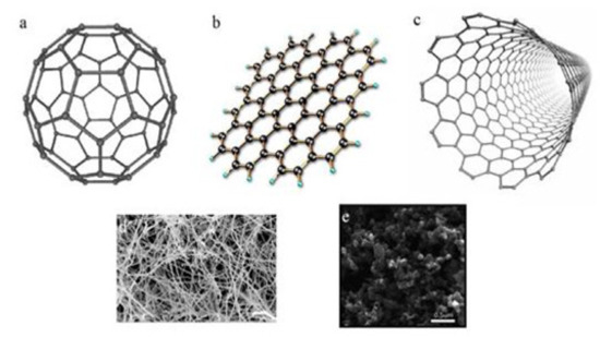 Structures of carbon-based NPs (a) fullerenes, (b) graphene, (c) carbon nanotubes, (d) carbon nanofibers, and (e) carbon black.