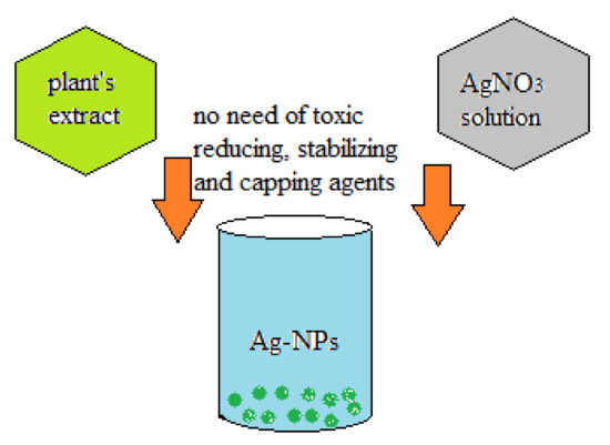 The green synthesis uses extracts from the different plants as a source of capping and reducing agents in the preparation of AgNPs; it is suggested that the bio-molecules, especially secondary metabolites in those extracts, could reduce the Ag ions. They consist of vitamins, polysaccharides, amino acids, proteins, enzymes, polyphenolics, flavonoids, and other secondary metabolites [89,90]. Likewise, proteins found in the plant extracts also play an essential role as a reductant of the Ag+ and as a size controlling agent for the formulation of AgNPs. Functional groups such as carboxylic (COOH) found in glutamine and aspartic residues and OH group of the tyrosine residues are considered responsible for stabilizing Ag ion and producing small nanoplates of Ag with a little polydispersity [91].