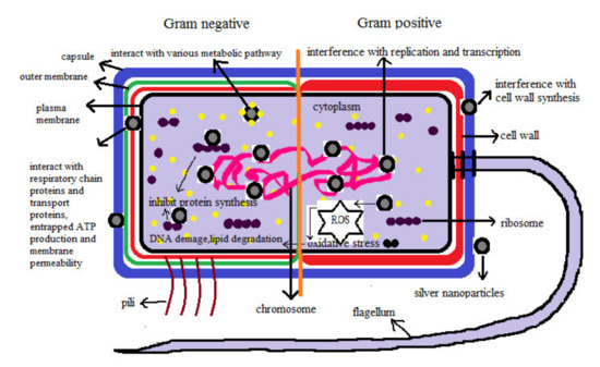 AgNPs synthesized biologically have characteristic features such as hydrophilic nature, large surface area, and improved stability. This synthesis technique has quite a few benefits as it is economical, simple, regenerable, and needs a small amount of energy compared to particles synthesized by chemical techniques. The AgNP macrophages have been obtained, and their morphology suggests their instability with intermittent rod-like and spherical NPs produced in the diameter extent of 5–40 nm [106,107]. These biosynthesized nano-size particles were studied within the peri-plasmic part of the bacteriological cell among the interior and exterior cellular membranes.