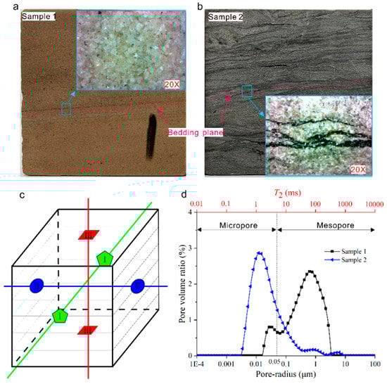 We used two different kinds of bedded sandstones: sample 1 was an orange bedded sandstone, while sample 2 was grey sandstone. The porosities of these samples were 17.39% and 7.02%, respectively. Used supereyes to observe the rock surface, it can be seen that sample 1 has a bedded structure, which is not obvious, and the distribution of mineral grains is relatively uniform (Figure 1a). The bedding structure of sample 2 is more obvious and the size of the mineral grains differs according to the bedding type (Figure 1b). The pore size distribution of a rock (Figure 1d) can be calculated according to its NMR T2 spectrum (Equation (3)). Based on the rock pore size classification proposed by Jia et al. [], pores with apertures < 0.1 μm are classified as micropores, those between 0.1 μm and 1000 μm are mesopores, and those > 1000 μm are macropores. The pore size distributions can be described as follows. Sample 1: double peak with a high proportion of mesopores. Sample 2: single peak with a uniform pore distribution and high proportion of micropores. For testing convenience, the rocks were processed into cube samples 75 mm on each side. These were tested in three directions (≥I-I, II-II, III-III) by ultrasonication. Directions I-I and II-II were parallel to the bedding direction, while III-III was perpendicular to it (Figure 1c).