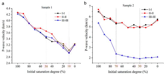 Figure 2a shows the variation in P-wave velocities according to saturation degree in sample 1 in the three directions (I-I, II-II and III-III). It shows that the P-wave velocity in these three directions varies with saturation basically the same. The P-wave velocities in the three directions had the same trends: all decreased with saturation (from 100% to 10%) but increased when the sample was almost completely dry (from 10% to 0%). In sample 2 (Figure 2b), directions I-I and II-II were parallel to the bedding direction, so the P-wave velocities in both directions were similar. Meanwhile, the III-III direction was perpendicular to the bedding and the figure shows that the P-wave velocities in this direction were much lower than in the other two directions. This difference increased as the saturation decreased. Moreover, the variation in P-wave velocity with saturation in the direction parallel to the bedding was different from that in the perpendicular direction. In parallel directions, at saturations > 30%, the wave velocity decreased with saturation; while at saturations < 30%, the P-wave velocity increased. In the perpendicular direction, the P-wave velocity showed a two-stage trend with decreases in saturation; at saturations > 70%, the P-wave velocity decreased rapidly from about 5.5 km/s to about 2 km/s with decreases in saturation; while at saturations < 70%, P-wave velocity was largely unchanged.