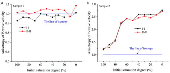 Sample 2 had an obvious bedding structure. It can be seen from Figure 2b that the P-wave velocities parallel to the bedding direction were significantly higher than those perpendicular to the bedding under both dry and saturated conditions. This difference increased with decreases in saturation. This, combined with the variation in the anisotropy of sample 2 during dehydration (Figure 3b) shows that the P-wave velocity of bedded sandstone is mainly controlled by the compactness of the bedding plane []. Many test results have also proven that the moisture content of rock has a great influence on the P-wave velocity perpendicular to the bedding direction, but a small influence on it in the parallel direction [,].