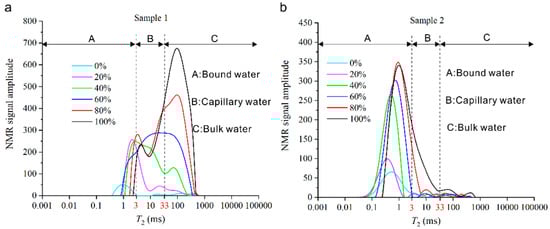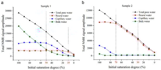 In sample 1 (Figure 5a), at saturations > 50%, the bound water and capillary water contents were basically unchanged, but the bulk water content gradually decreased. As the saturation decreased from 50% to 10%, the bound water content remained the same, while the capillary and bulk water contents decreased. At saturation < 10%, the bound water content decreased but the capillary and bulk water contents remained almost the same. It can be seen from the above results that at saturations > 50%, the decrease in pore water was mainly due to the decrease of bulk water, and at saturations of 50–10%, the decrease in pore water is mainly caused by bulk water and capillary water; while at the saturation < 10%, the change in pore water was because of bound water. In sample 2 (Figure 5b), at saturations > 70%, the bound water content was largely unchanged, the capillary water decreased with saturation, and the bulk water decreased slightly. At saturations < 70%, the bound water decreased linearly but the capillary water and bulk water were largely unchanged. Therefore, at saturations > 70%, the reduction in pore water content was mainly due to the decrease of capillary water and, at saturations < 70%, the change in pore water was mainly caused by bound water.