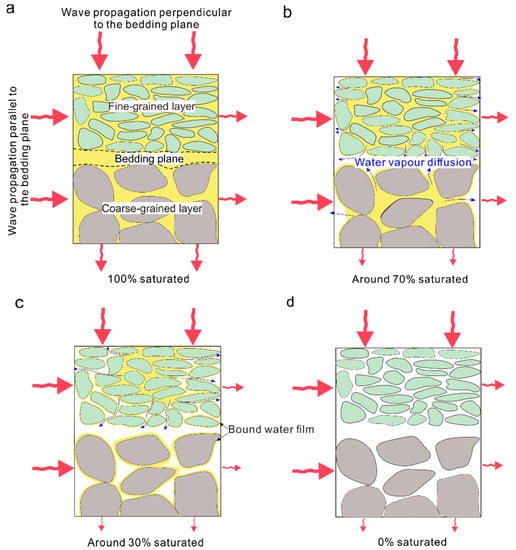 The above results and analysis demonstrate that the waves propagate in greatly different paths in the perpendicular and parallel directions in this kind of sandstone. In the parallel direction, the elastic waves propagate in two paths: in the coarse-grained layer and in the fine-grained layer (Figure 6a). In the direction perpendicular to the bedding, ultrasonic waves propagate alternately between the grained layers and the bedding planes (as shown in Figure 6a), both through the bedding plane (which has good pore connectivity) and through the grained layer (which has good continuity between particles, especially in the fine-grained layer). Therefore, there are more refracting interfaces in the perpendicular direction than in the parallel direction, and the difference in pore size between the coarse- and fine-grained layers also has a great influence on wave propagation. So, the wave velocity in the perpendicular direction is significantly lower than that in the parallel direction at full saturation, indicating that this bedded sandstone has an initial anisotropy.