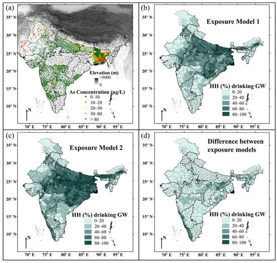 District-wise map of spatial distribution of India groundwater arsenic and exposure data utilized in this study. (a) District averaged arsenic concentrations and topographic elevation. (b) Exposure model 1: district-wise percentage of households (HH) drinking groundwater via hand pumps and tube wells/boreholes. (c) Exposure model 2: district-wise percentage of households (HH) drinking groundwater via covered/uncovered wells, hand pumps, and tube wells/boreholes. (d) Difference (expressed as percentage of households) between exposure models 1 and 2.