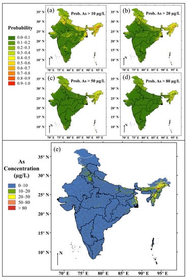 Modelled hazard maps of groundwater arsenic in India. Probability of groundwater arsenic exceeding (a) 10 µg/L, (b) 20 µg/L, (c) 50 µg/L, and (d) 80 µg/L. (e) Pseudo-contour map of groundwater arsenic concentrations defined here using a probability cutoff value of 0.5.