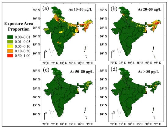 The probability maps (Figure 2a–d) of arsenic concentration exceeding 10, 20, 50, and 80 µg/L in groundwaters were transformed into a pseudo-contour map (Figure 2e) of groundwater arsenic concentrations using a probability cutoff value of 0.5. The concentration map captured a significantly high hazard of groundwater arsenic in the north and northeast India, particularly in Assam and West Bengal, mainly consistent with previously well-known documented high hazard areas [22]. The district-wise proportions of areas with various groundwater arsenic concentration ranges were calculated (Figure 3, and Table S4), showing over 50% of areas of several districts in the Ganges and Brahmaputra alluvial plains, in Punjab, and in less known areas of Haryana and NCT of Delhi with groundwater arsenic greater than 10 µg/L, the provisional guideline value of arsenic in drinking water recommended by the World Health Organization (WHO) [59].