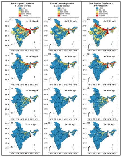 Thus, district-wise rural (), urban (), and total () population exposed to groundwater arsenic exposure level were estimated by Equations (4)–(6), respectively: