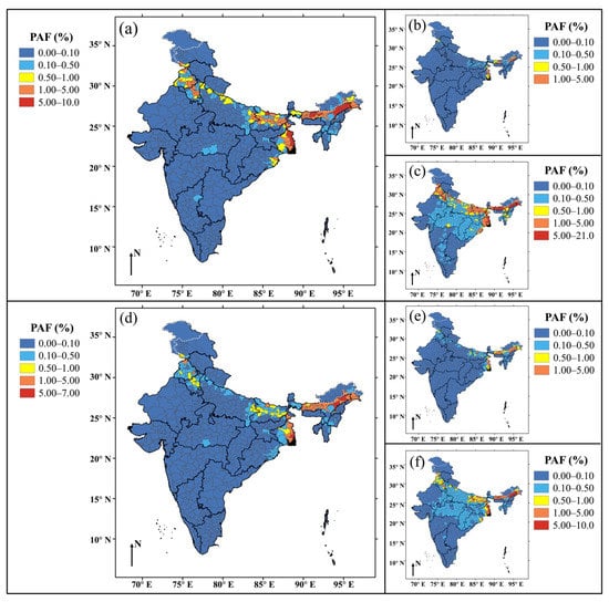 District-level maps of India showing (a,d) population-attributable fraction (PAF) of high groundwater arsenic-attributable CVD mortality with error boundaries (lower (b,e) and upper (c,f) limits) based on exposure model 1 (see text). PAF estimations were based on both linear (a–c) and non-linear (d–f) dose–response relationships between cardiovascular disease mortality and arsenic concentration in drinking water.