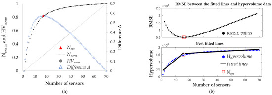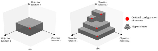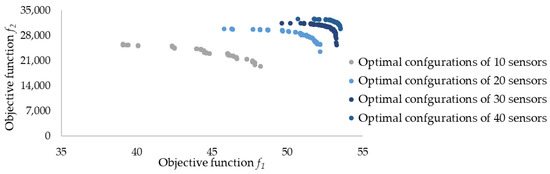 The hypervolume indicator was calculated for each Pareto front of each set of numbers of sensors, leading to a total of five sets of Hypervolume values (i.e., one for each set of numbers of sensors). The global worst point was considered equal to (0,0) since both functions aimed at the maximization of the objective function. The calculation method for the hypervolume was based on variant 3 of the algorithm proposed by Fonseca et al. [42]. The five sets of hypervolume values are depicted in Figure 7 as black triangles.