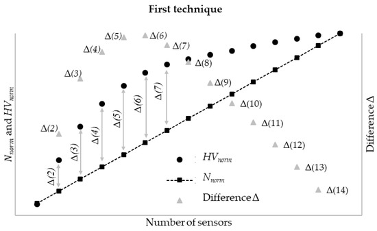 The first technique, the Kneedle method, starts by rescaling the estimated hypervolume data to [0,1], leading to the normalized hypervolume values, HVnorm. The number of sensors between 1 and Nmax should also be rescaled to [0,1], leading to the normalized number of sensors values, Nnorm. These values are represented in Figure 3 as black circles and squares, respectively, considering Nmax = 15 in this example. Finally, the differences Δ between HVnorm and Nnorm are calculated, as exemplified with grey arrows and triangular markers in Figure 3. The optimal number of sensors, Nopt, is selected as the number of sensors that presents the maximum difference.