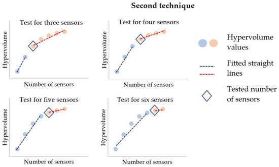 Determination of the optimal number of sensors based on the evolution of the hypervolume using the second technique.