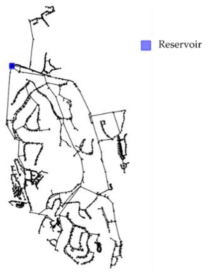 This methodology is demonstrated in a real WDN with a total network extension of ca. 70 km, 2200 service connections and an average inlet flowrate of about 60 m3/h. The supplied area consists mainly of single-family houses with irrigated gardens, most of them with a swimming pool. The WDN also supplies a few golf courses. The hydraulic simulation model was developed in EPANET [48] and included four storage tanks, 4474 pipes and 4429 nodes, of which 2200 were consumers with an individual hourly demand pattern. Figure 5 presents the layout of the hydraulic network.