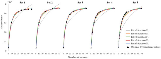 The increase in the number of installed sensors led to a higher total gain. Nonetheless, the marginal gain decreased when considering additional sensors. This is visible in Figure 7 in black triangles. This figure shows that regardless of the considered number of sensors in the set, the function F1 (grey line) clearly fails to mathematically describe the trend of the hypervolume as a function of the number of sensors, whereas the remaining functions can approximately describe the hypervolume variation.