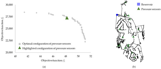 (a) Pareto front for 16 sensors; (b) optimal pressure sensor location for 16 sensors.