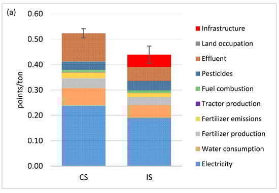 Total environmental impact as a single score at the process (a), indicator (b), and sub-system (c) level for 1 ton of table grapes with conventional (CS) and integrated (IS) system. Monte Carlo standard deviation results are indicated with a black line.