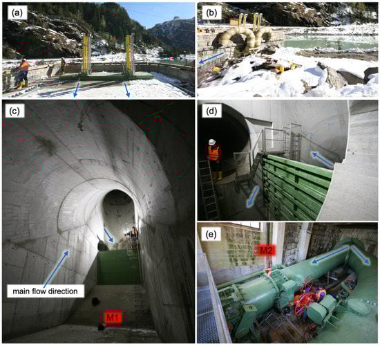 Main components of the new protection concept—intake gates (a) with additional ventilation (b); the new wall at the bottom of the surge tank (c,d) and division of the two penstocks including the valves (e)—blue arrows indicate the main flow direction under normal operation— indicates the filling pipe which was used as an upstream measurement point and marks the downstream measurement point.