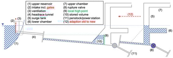 Figure 2 provides a sketch comparing the original concept with the new approach and summarises the main components of the hydraulic system. The PSV is the main component in the original system (Figure 1c). The valves close automatically, as well as the intake gates, after the detection of potential damage. This proceeding separates the upstream reservoir and holds back the water upstream of the PSV. The new protection concept does not need the PSV and mainly uses the intake gates. Those two replaced gates located at the upper reservoir close to 100 s after triggering an emergency proceeding (Figure 1a). The closing time is a result of an optimisation process considering the limitation of the gate as well as the needed ventilation behind the gate, which required additional pipes (Figure 1b). Similar to the previous concept, the upper reservoir is separated from the downstream hydraulic structure. The water level in the headrace tunnel decreases down to the top of the newly included wall (Figure 1d,e), which allows storage of the water volume independently of what happens with the penstock. A bypass pipe provides the opportunity to fill the penstock slowly, which is also used for the presented measurements in Section 3. This can only be done with personnel on-site, which is deliberate, ensuring that the complete downstream waterway has been checked previously. The advantages and disadvantages of the concept are further discussed in Section 4.
