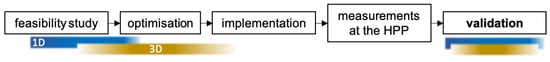 The first aim of this paper is to provide an overview of the methodological approach to achieving the final geometry that was implemented. Figure 3 visualises the different steps from the initial feasibility study to the final measurements after the refurbishment of the HPP. Two different numerical approaches were used: 1D-numerical simulations covering big parts of the hydraulic system and local refinements with 3D-numerical simulations.