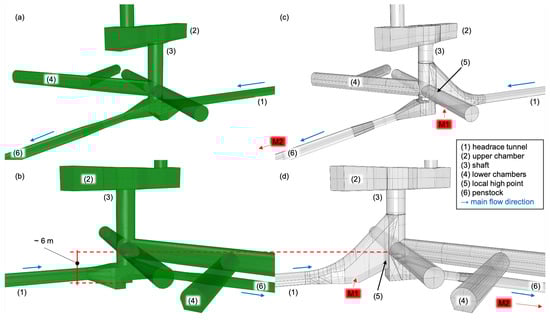 Figure 4. Comparison of the original geometry of the surge tank in green (a,b) with the new approach including the wall and extra excavation (c,d)—normal flow direction under steady operation marked with blue arrows— indicates the filling pipe which was used as an upstream measurement point and marks the downstream measurement point. - The water level behind the wall remained very close to the top of the wall;
