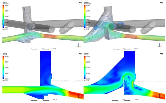 Numerical results for a constant discharge of 7.079 ms—comparison of the original geometry of the surge tank (left column) with the new approach including the wall and extra excavation (right)—streamlines (upper row) and cross section at the -plane (lower row).