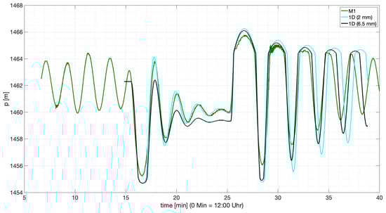 At the beginning of the measurement campaign, a zero measurement was conducted, which allowed us to reference the additional pressure transducer at and with the pressure measurement close to the turbines as well as the water level in the upper reservoir. Therefore, all turbines were stopped and the remaining mass oscillation had to be averaged out. An approximately 15 min long measurement series was cut out and used for the evaluation. Measured pressure values in [bar] are converted to [m] based on Equation (1) assuming a constant gravity acceleration g of 9.81 [m/s] and water density of 998 [kg/m] as well as a constant vertical offset [m] specific for each instrument.