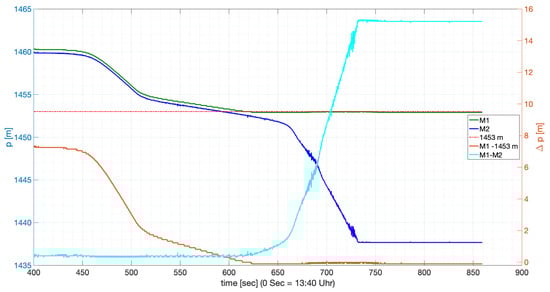 Figure 7 shows the pressures at the two points, , upstream of, and , downstream of, the wall. The water level in the surge tank is approximately 7.5 m higher than the top edge of the newly installed wall at 1453 m. Due to the constant discharge, the offset between the two measurement points stays the same with the falling water level, hence they are caused by the local loss and velocity difference. This went on until the water level reached the height of the top edge of the inserted wall. The value stayed there with a difference of approximately 10 cm shown by the difference -1453 m graph in Figure 7, which is an excellent result in relation to the accuracy of the instrument. Pressure at further decreased down to 0 bar. The ventilation of both penstocks could be clearly heard and felt at the location of the measurements close to downstream of the surge tank. At this point, the discharge through the turbines was stopped to reduce the water loss as well as the time needed to fill the system again. There was sadly no time to access the surge tank to check the water level behind the wall, because the HPP had to be brought back into operation as soon as possible. Nevertheless, the simulation of a break of the penstock showed the expected results and proved the concept of the submerged wall.