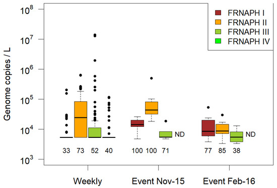 Concentration of genome copies of F-specific RNA bacteriophage (FRNAPH) I, II, III and IV measured in the weekly samples and during the storm runoff events occurring in November 2015 and February 2016. The genogroup FRNAPH IV was not measured in the samples collected during the runoff events. Numbers below the boxes indicate % of samples from which genome copies were detected.