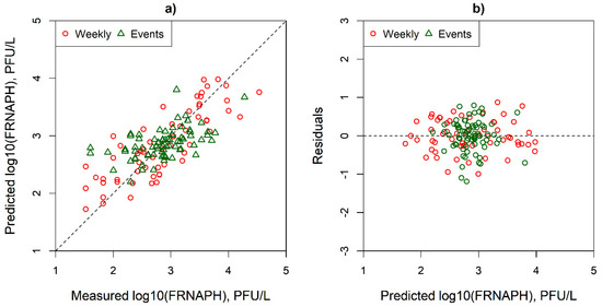 (a) Scatter plot between the measured and predicted log-transformed FRNAPH concentrations, and (b) the residuals versus predicted log-transformed FRNAPH concentrations from the hydrological and meteorological variables for the weekly and event datasets.