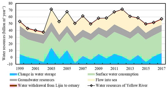 The average amount of total water resources of Yellow River is about 55.9 billion m3 year−1 for nearly the past 20 years which include surface water, groundwater, water storage in reservoirs and so on, and the total amount of water resources in most years is between 50–70 billion m3 year−1 (shown in Figure 2) []. According to the consumption types identified in the Yellow River basin, the multiple demands are centered on the agricultural, industrial, domestic, public, and urban ecological water sectors. Water use competition has intensified among different water sectors as well as several provinces along the Yellow River.