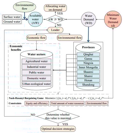 The issue of the effective and rational allocation of available water resources in this study is essentially a game of resources between different water sectors. A variety of methods and models were applied in the allocation of water resources, among which approaches based on game theories are a kind of effective method for implementing water allocation among different water sectors [,,,,,]. In terms of methods based on game theories, the behaviors of different rational decision-makers are taken into consideration and the different interests of multiple decision-makers can be identified, which reflect the equilibrium of the direct interactions among multiple rational decision-makers. The Nash–Harsanyi bargaining game model [,,] is employed in this study which is applied to resolve resource sharing issues among different users that have overlapping demands on available resources in a more sustainable way.